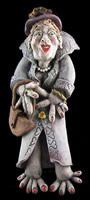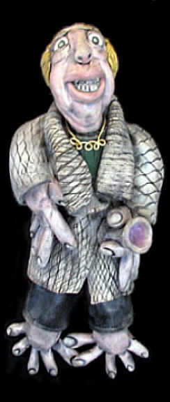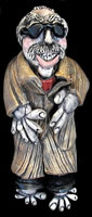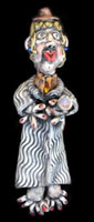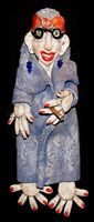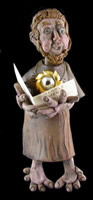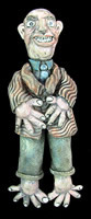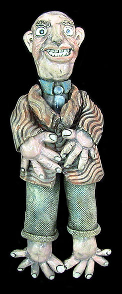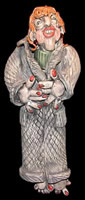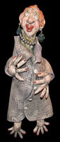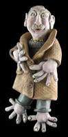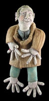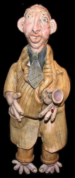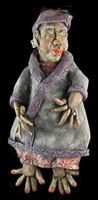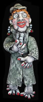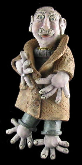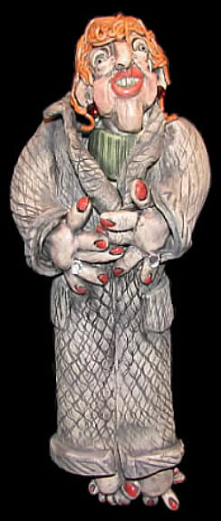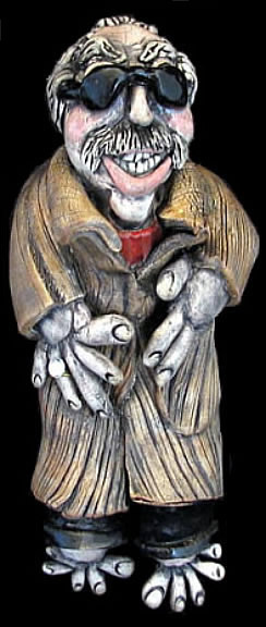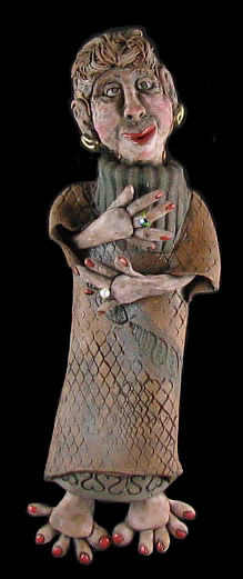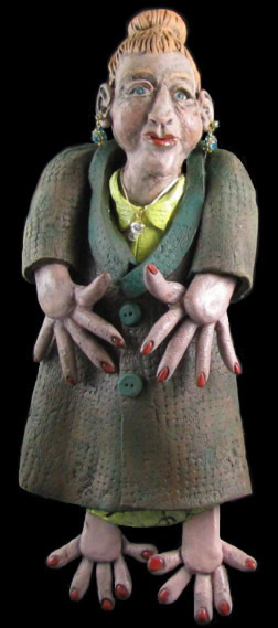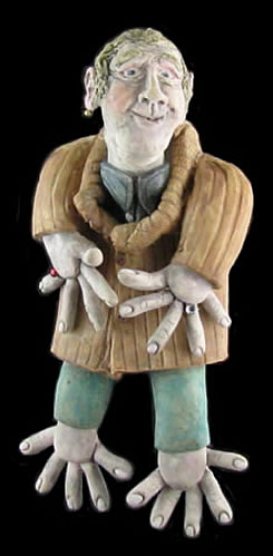 I hope you enjoy my happy little people. When I touch clay, my imagination goes wild and I sometimes never quite know what the outcome will be. In this case it was these humorous little people that constantly make me smile! These little Curmudgeons (cur`mudg`eons’) have been individually sculpted; nothing has been molded so they are truly originals’. Creating them is a time consuming process but with each curmudgeon, I discover interesting ways in which to make the clay work for me. It also is a very fragile art form; think of their little fingers and toes! As the clay dries it becomes very brittle, and the slightest touch can cause the loss of a body part or clothing. After the first kiln firing (bisque firing) they can be carefully handled and I can breathe easier as they are less susceptible to breakage. I stain and glaze my Curmudgeons after the bisque firing and once again fire them, this time to a higher temperature where the clay becomes stronger. Then, I have fun adding jewelry and such. Each Curmudgeon has there own story that developes as they are sculpted. Their name comes first, as I sculpt the face, and the rest of their story unfolds as their body and clothes are formed. Who knows what the next “Happy Curmudgeon’” will be? It’s all up to the cosmos and my imagination! Thanks for taking the time to view my little creations! |